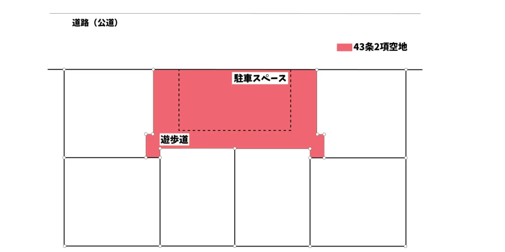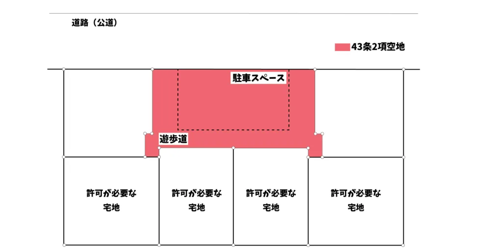 そこで役所調査をしてみると、この駐車場一帯は一宅地で分譲する際に43条空地(旧:但し書き/現:2項2号)で申請されていて、その空地を使って建物は建てられていた事がわかりました。