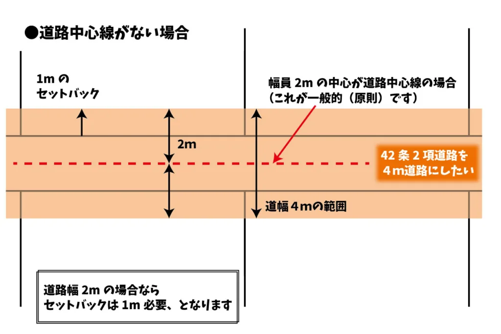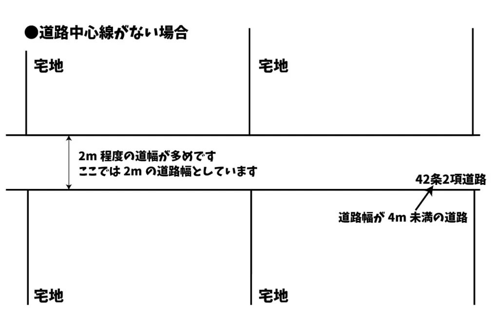 そういった4m未満の道路幅に接する住宅地の建物を全て既存不適格にするのも難しいので、建築基準法42条2項で「4m未満の道路の中心から2m(3m)の線をその道路の境界線とみなす」という救済措置条項が定められています。