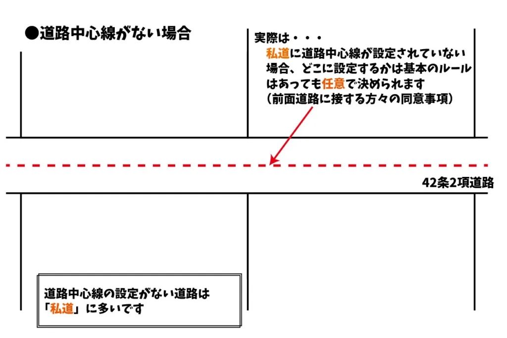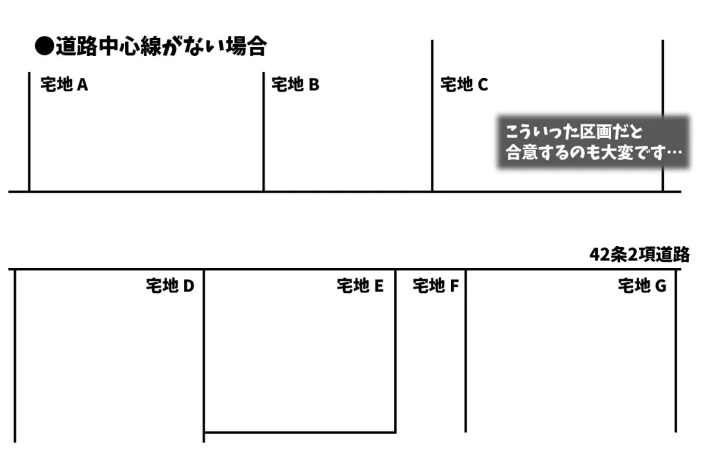 道路中心線がない道路というのは、42条2項でみなし規定はあっても、本当にどこが道路中心線か未だ測っていない道路を指します。現況からここが道路中心線だよね、と個人が勝手に決められるものでもないので、そういった場合にはお役所に「調査をした結果、このポイントが道路中心線でいいですね?」とお伺いを立てる役所との協議(道路調査の申請)が必要です。これには私道で度々みられるケースがありますが、時々公道でもみられます(私道から公道になったケースなど)。