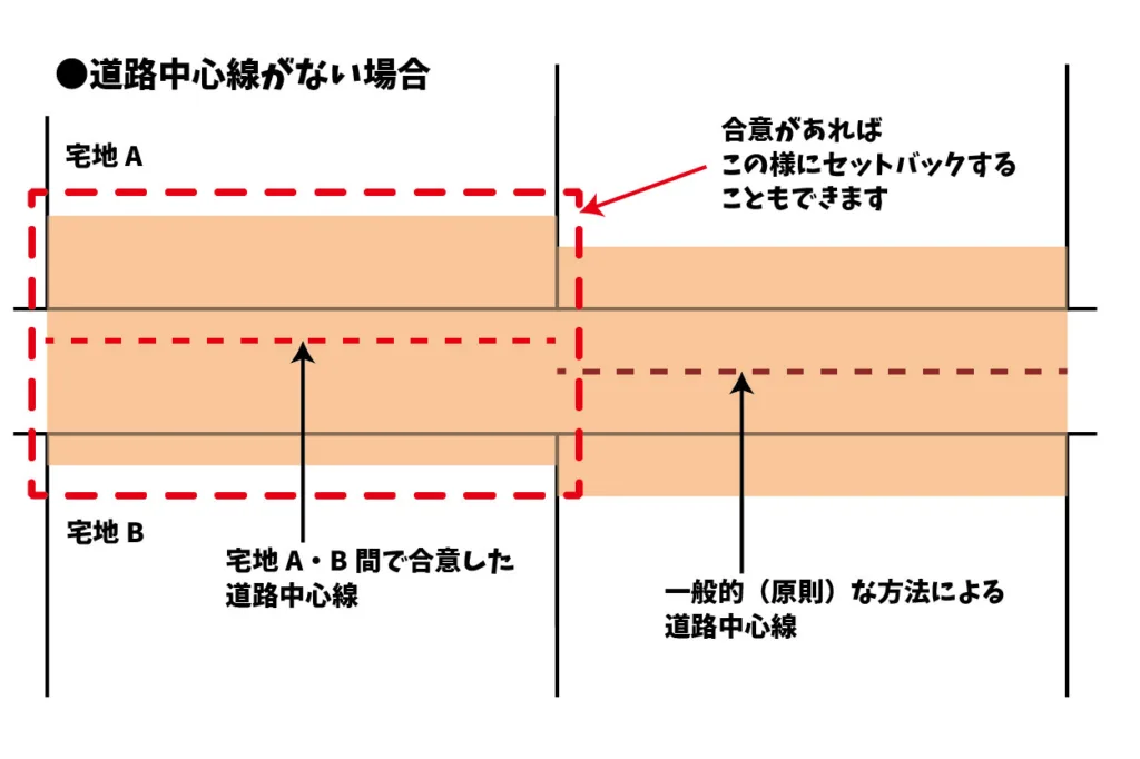 例えば宅地Bの所有者が不動産業者で、原則の通りに道路中心線を設定すると宅地Bが分筆できない場合に、中心線をずらすことで分筆ができる様になる、などが想定されます。セットバックをすると、その道路部分は建物を建てる際の敷地面積に換算されないからです。