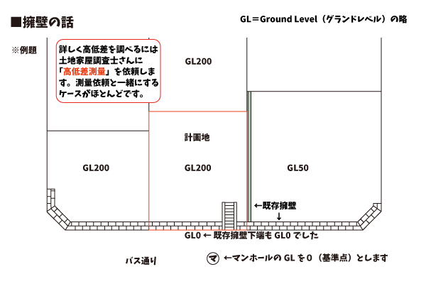 GL200(厳密には㎜単位まで測りますので、本来は4桁の記載です。ここでは分かり易く「㎝」表記としています)とは、計画地の前面道路にあるマンホール(動かない目印として)を「高さ0㎝」にした場合、土地の高さはそこから200㎝上がっている、という意味になります。