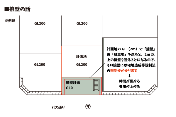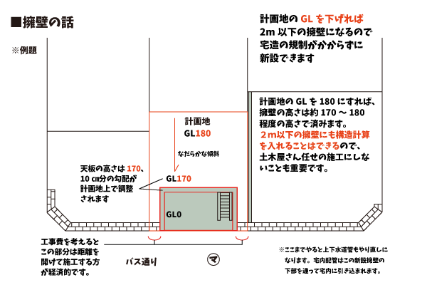 この計画案の様にGL200㎝に対して擁壁を設けようとすると、高さ200㎝の擁壁を立ち上げることになり、その場合だと宅地造成等規制法の規制がかかることになるので、時間や費用が余計に係ることになります。そこで土地の造成も含めて検討し直すことにしました。
