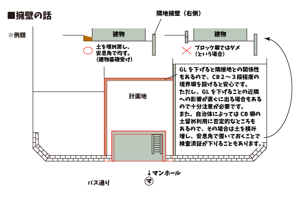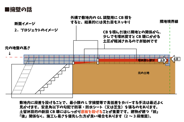 現在「宅地造成等規制法」は熱海の土石流災害もあって、「盛土規制法」と抜本的に改められました。それよりも以前から(阪神淡路大震災以降)、全国的にコンクリートブロック(CB)での土留め目的の擁壁利用が厳しくチェックされる様になってきていて、新たに戸建てを建てる際や建て替えをする際には地域差もありますが、自治体からの敷地内外の高低差に対して指摘も多くなってきた印象です。