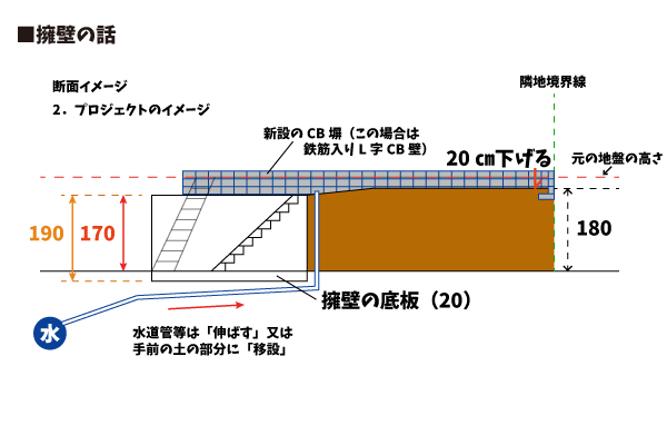 計画地全体のGLを20㎝下げ、更に敷地内で新設の擁壁に向かって10㎝下がっているイメージ図です。この部分は実際に天板に立って見てみると余り実感し辛い部分です。