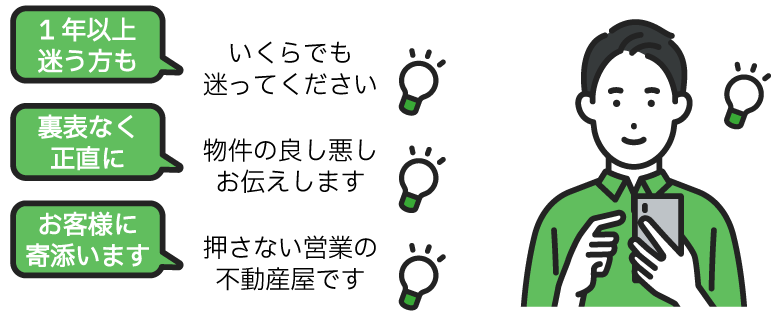 不動産を探していると、不動産への考え方や条件が変わることはよくあることです。いまはこう思っていても、数か月後には違うことを思っているかもしれません。そんな迷いや考え事に、弊社は寄り添いますし、一緒に答えをみつけていきたいと思っています。