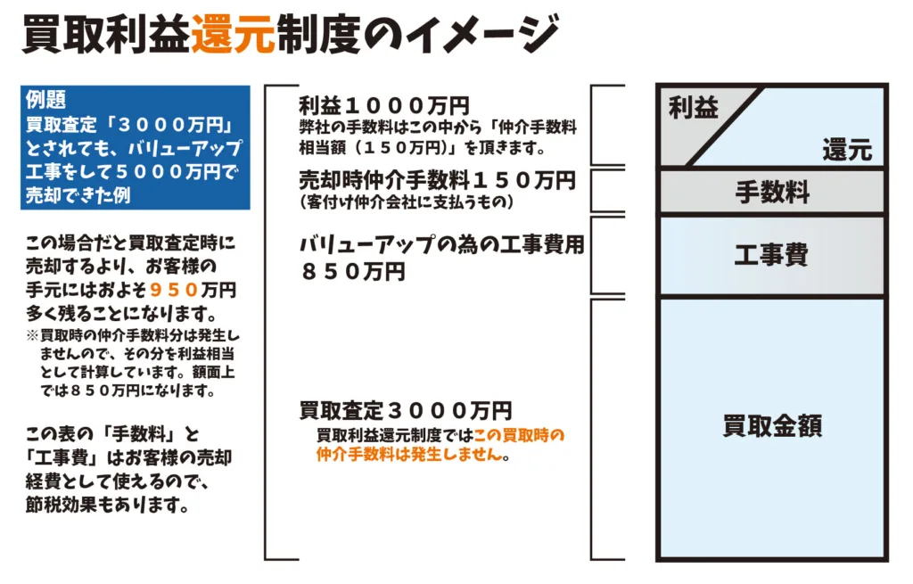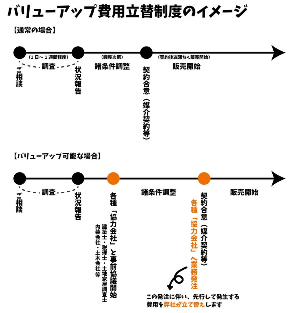 弊社の「売却サポート」の中には「利益還元制度・バリューアップ費用立替制度」というものがあります。これは、不動産会社が販売する様な形で販売していき、売値のアップを目指していくものです。