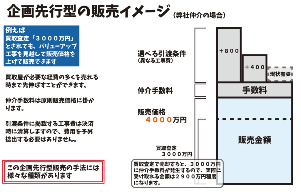 買取屋が不動産を買い取って色々やって高く売る、なら最初から高く売る方法をお客様にご提案して、それを一緒に行えばどうだろうか、それであれば「買取屋が儲ける利益を売主様に還元できる」ことにも繋がり、売主様にも買主様にもよかったと思えるお取引をご提供できる可能性が拡がります。